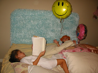 Well, we had an 18 day whirlwind visit from Grandma and Grandpa Brunet. Even Uncle Paul came in for a week! Emily did get the stomach flu in the beginning but thankfully, no one was yet visting overnight at our house. Emily also had another ear infection a few weeks before that! Well, I actually took off for a few days to go to Michigan. I saw my family and a couple of friends (Billie and Nico). Everyone I saw has younger kids than me and I was noticing how much more work that is! But, they do grow up fast! Meanwhile, back at home Grandma and Grandpa were in charge while Damien was at work! Almost all the pictures here are from Grandma's camera. Grandma loves to take pictures and since I haven't taken any I had many to chose from. You can see that Grandma was able to take Leanna to school and snap a shot at the door. She also go to have lunch and volunteer in Emily's classroom and get a shot of Emily playing outside on the playground. She even went incognito to the football game and got some undercover photos of Alyssa cheering. Alyssa wouldn't want anyone she knows to know that she actually has parents or a family! But nonetheless even Uncle Paul made it to the game. And what is that I see them eating in the picture....? Something their mother would never get them! Also, what is going on in Leanna's bed while I was gone? What is on her head? And what is with the balloons? You can see Damien's fun project he did with the girls - making a headboard for Leanna.